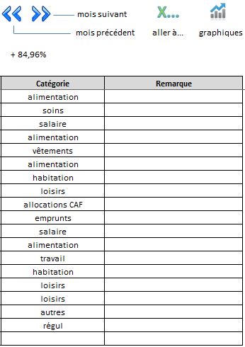 Afin de visualiser, pour le mois en cours, sous forme de tableaux et de graphiques le montant des dépenses et des revenus par catégorie, on clique sur l'image suivante, située en haut de la feuille Excel: